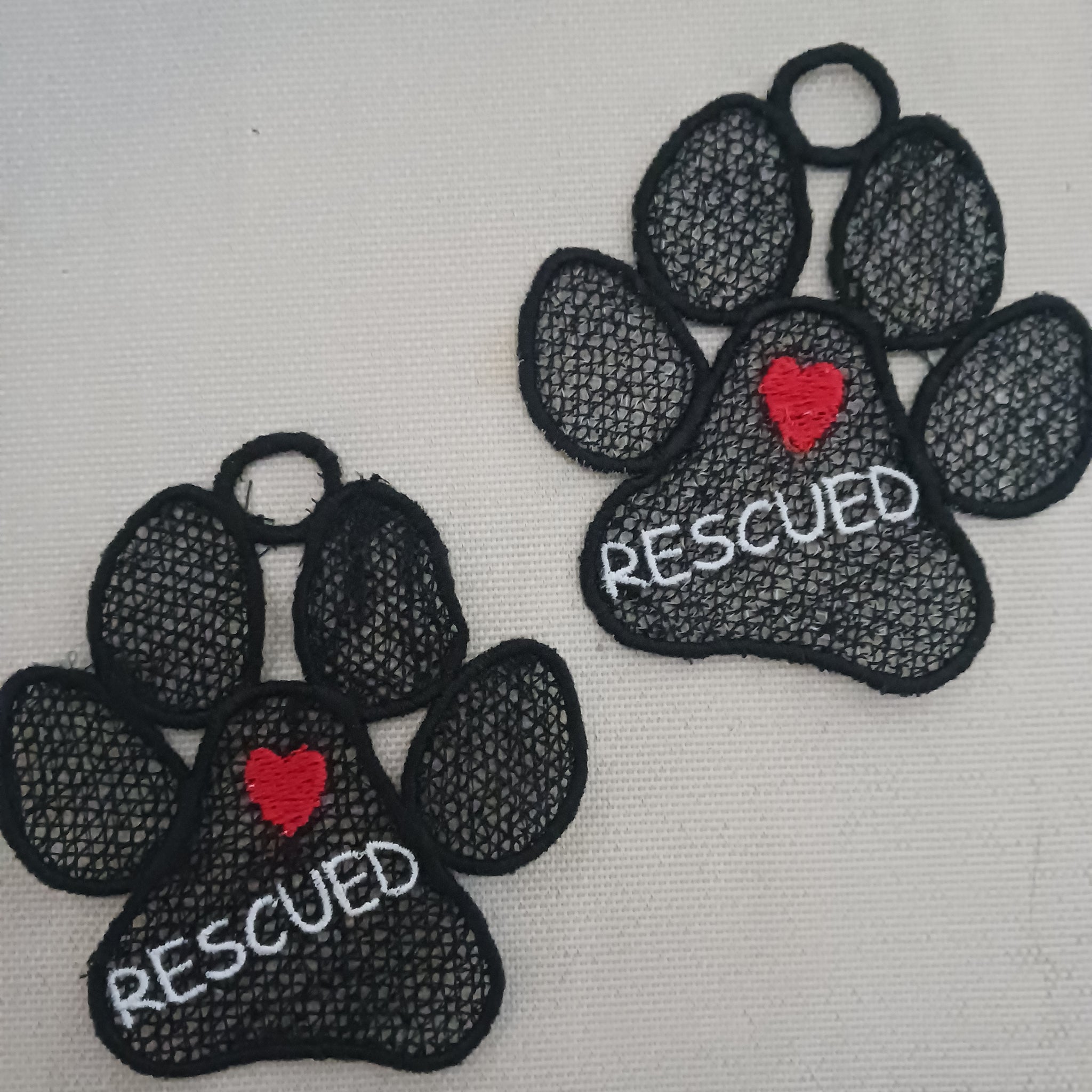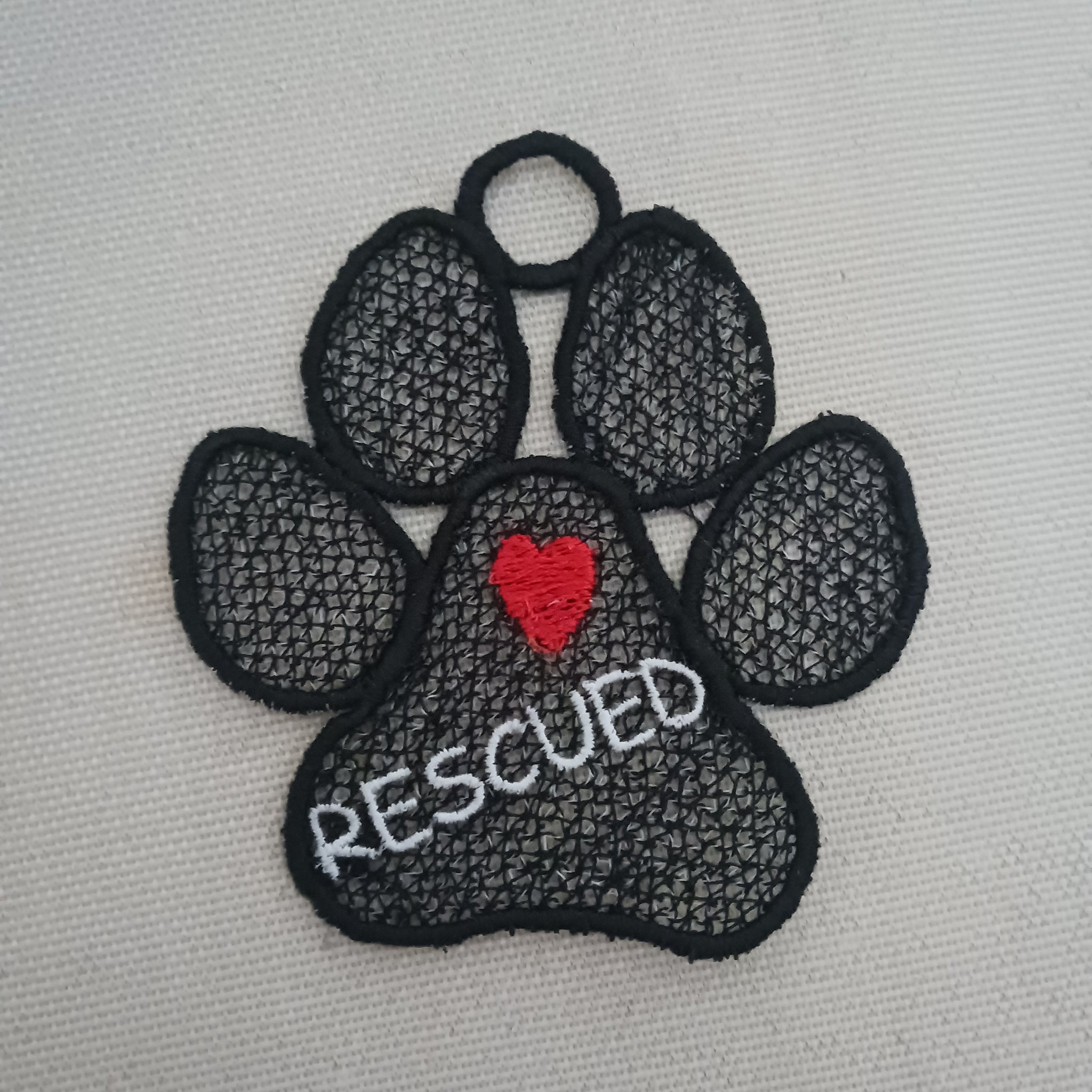 This Free Standing Lace dog paw ornament features delicate machine embroidery with a distinctive "Love Rescued" imprint on the paw. Expertly crafted, it serves as a meaningful decorative piece that honors rescued pets, combining intricate lacework with heartfelt symbolism. Perfect for display, it brings a touch of elegance and compassion to any space.
