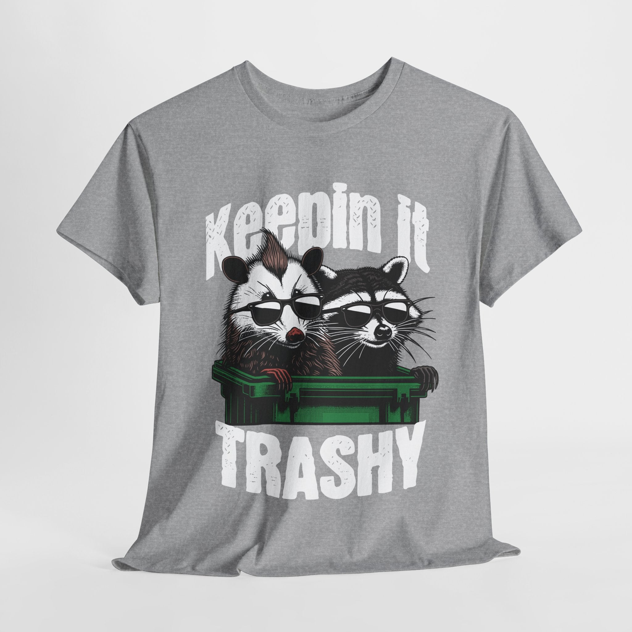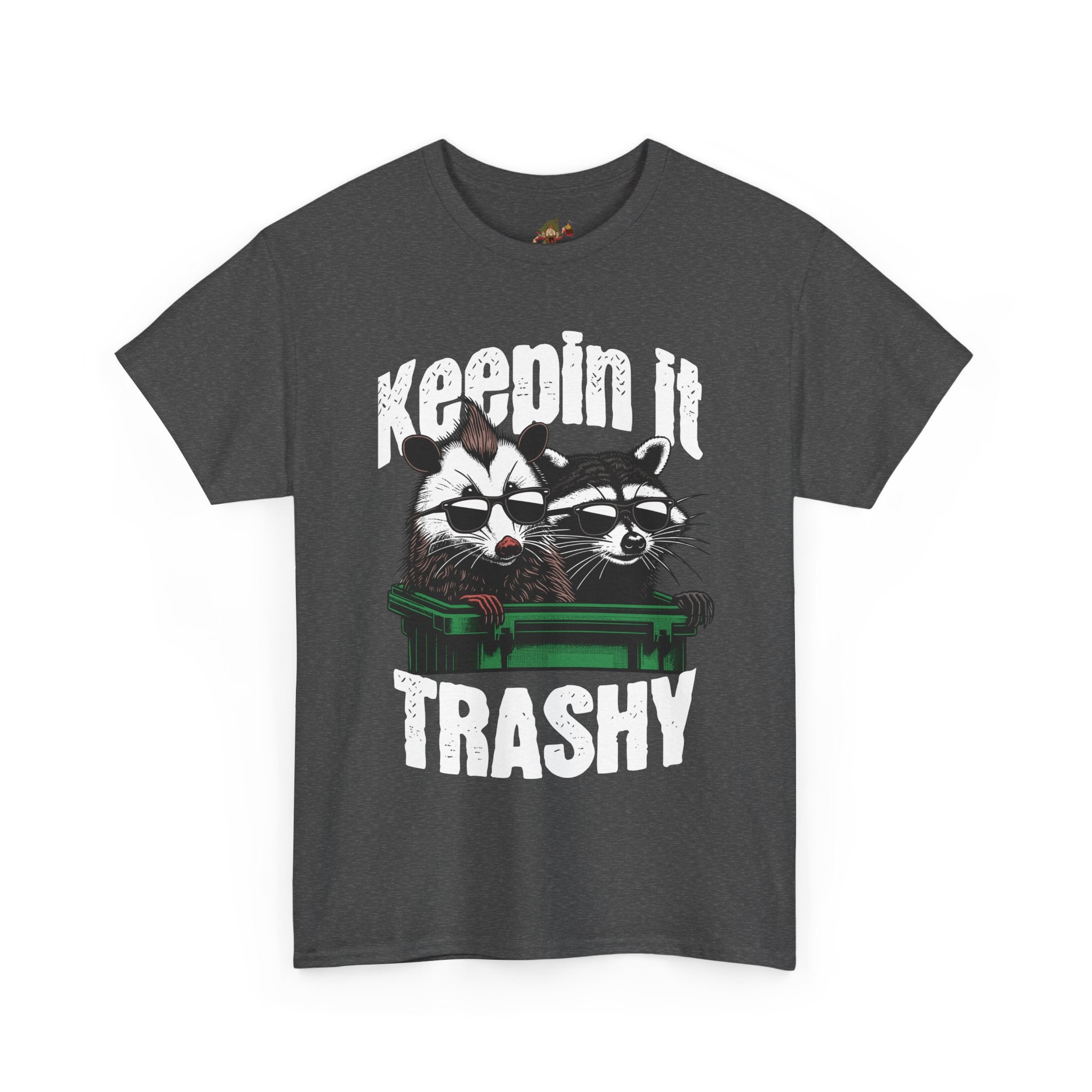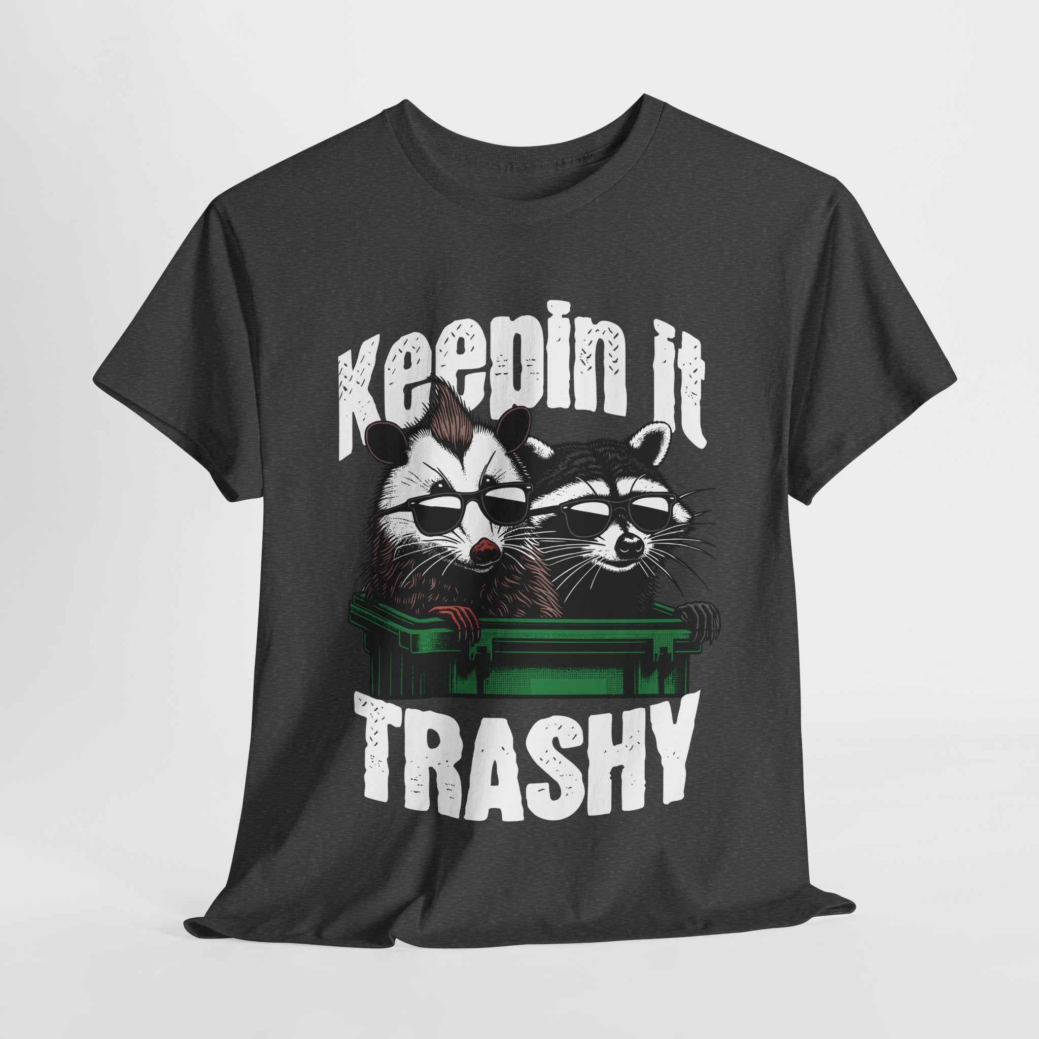 This Unisex Heavy Cotton Tee radiates a playful and humorous vibe, perfect for expressing your personality. Its bold graphic design featuring two raccoons and the phrase "Keepin' It Trashy" adds a fun twist to any casual outfit. Ideal for those who love to stand out and showcase their quirky side, this tee can easily become a staple in your wardrobe. Whether you're hanging out with friends, attending a casual gathering, or just enjoying a weekend retreat, this shirt fits seamlessly into any laid-back lifestyle. Great for gifting on occasions like birthdays, holidays, or simply for anyone who enjoys a light-hearted approach to life.