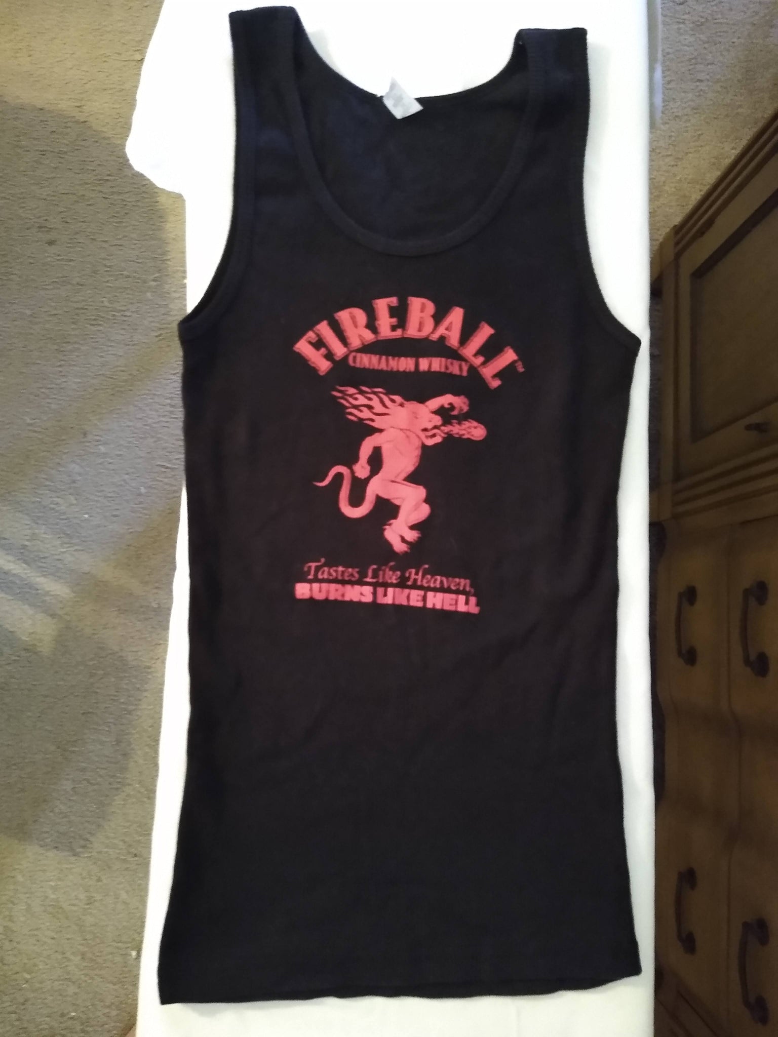 LOVE FIREBALL here is a Woman's tank top screen printed on front Fireball Whisky